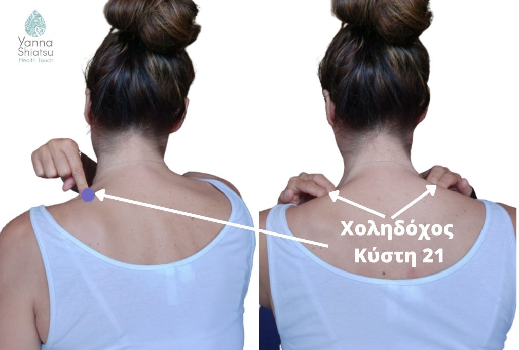 - Χοληδόχος Κύστη 21: Στην κορυφή του τραπεζοειδή μυ. Ιδανικό για πόνους από στρες και όταν συνυπάρχει σφ΄ίξιμο στον αυχένα και την κορυφή του τραπεζοειδή. Συνήθως είναι σφιγμένο το σημείο και πονάει στην πίεση.