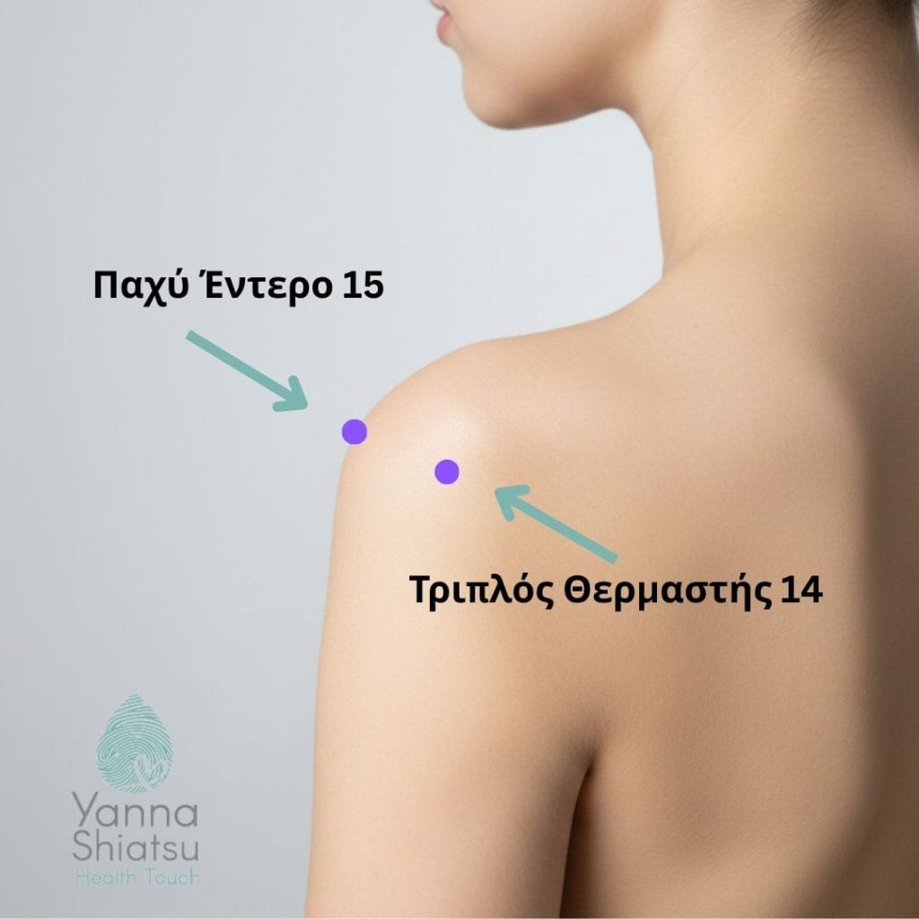 - Η μπροστινή εσοχή που βρίσκεται μπροστά και κάτω από το ακρώμιο είναι το σημείο Παχύ Έντερο 15