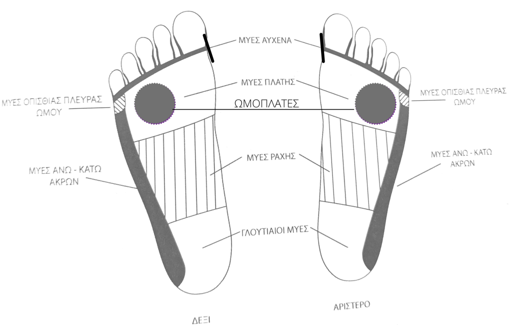 Στα πέλματα, η περιοχή που αντιστοιχεί στον ώμο βρίσκεται στην εξωτερική πλευρά, ακριβώς κάτω από το μικρό δάκτυλο πίσω, πλάι και μπροστά στο πέλμα. Μαλάσσοντας αυτή την περιοχή με κυκλικές κινήσεις, στέλνουμε το μήνυμα χαλάρωσης στην αντίστοιχη άρθρωση.
