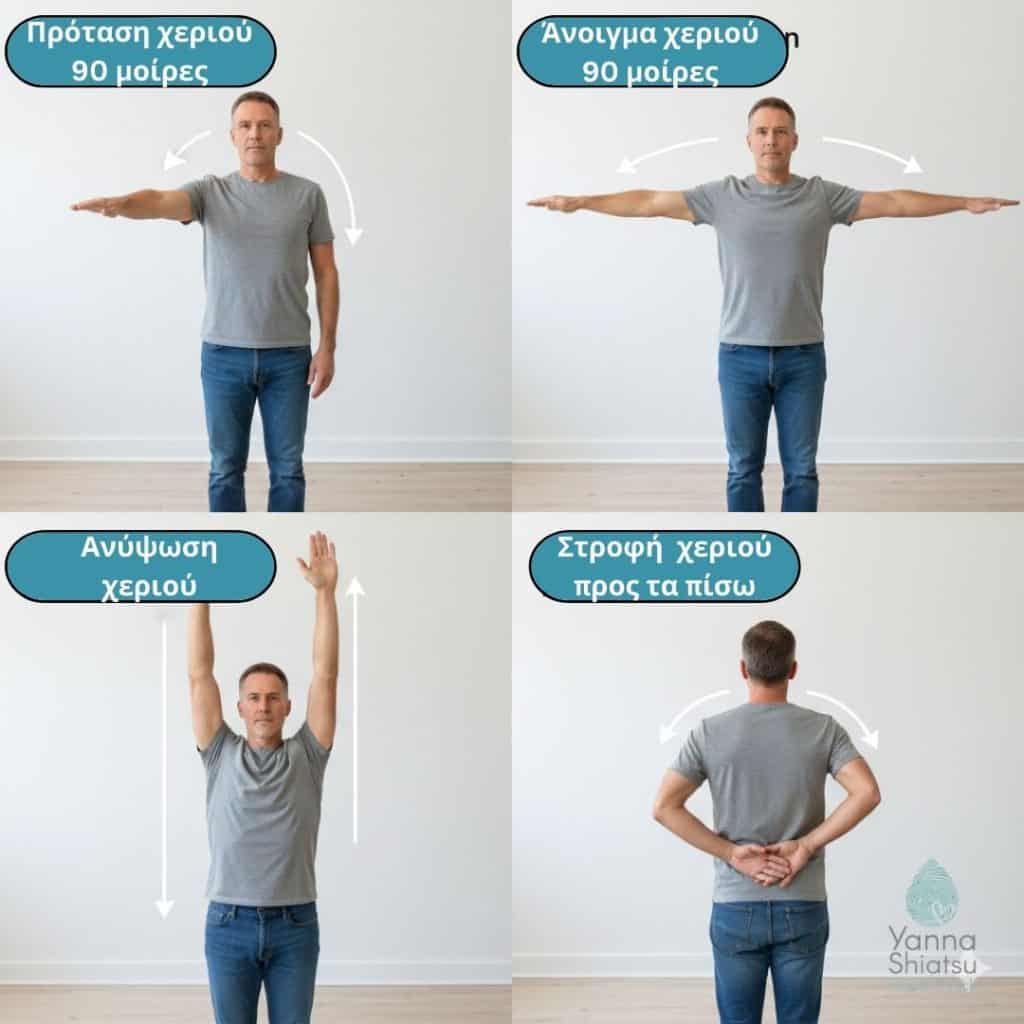 - Ανύψωση (κρατάς με την παλάμη τον ώμο σου και σηκώνεις το χέρι προς τα πάνω και μετά κάτω στον ώμο). 10 επαναλήψεις