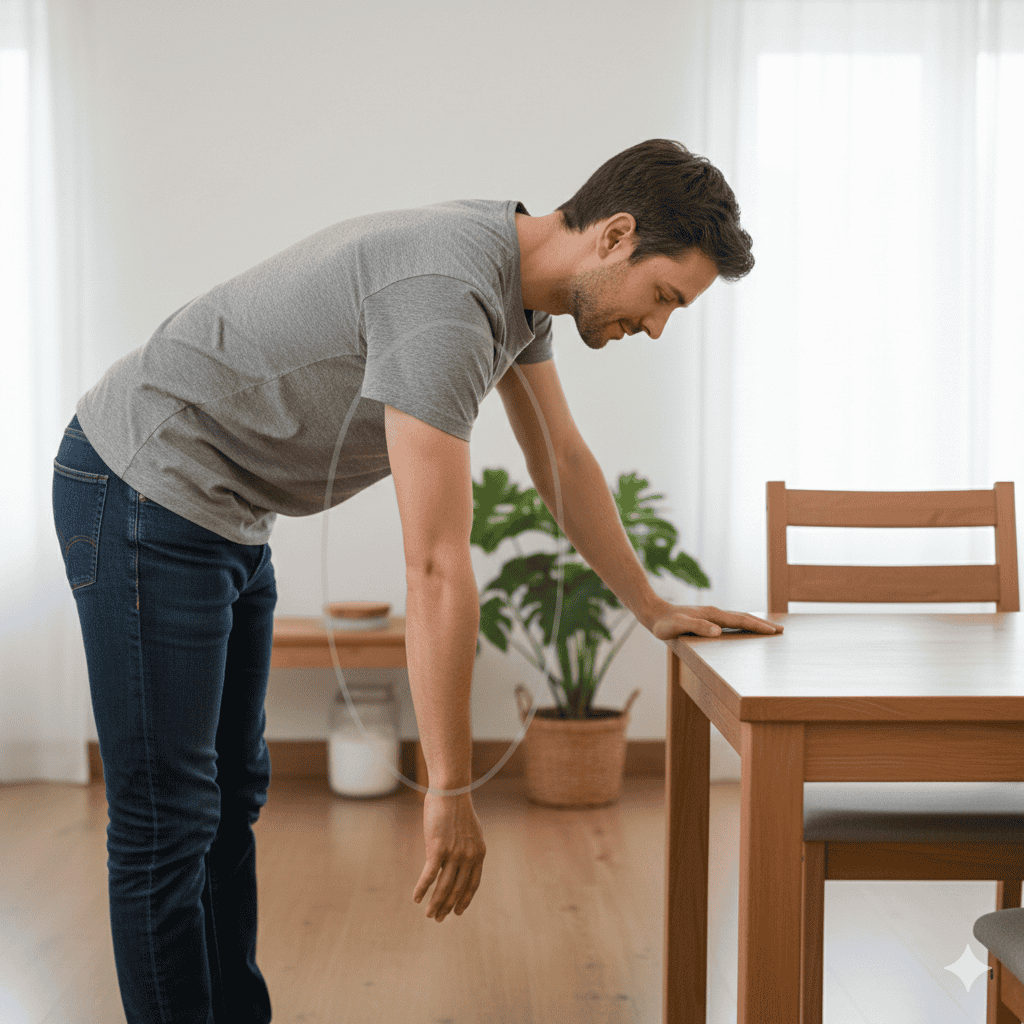 - Εκκρεμές: Η πιο ασφαλής κίνηση ακόμα και στην περίπτωση οξύ πόνου. Σκύψε ελαφρά στηριζόμενος/η σε ένα τραπέζι και άφησε το πονεμένο χέρι να κρέμεται, κάνοντας 10 μικρούς κύκλους δεξιόστροφα και 10 αριστερόστροφα
