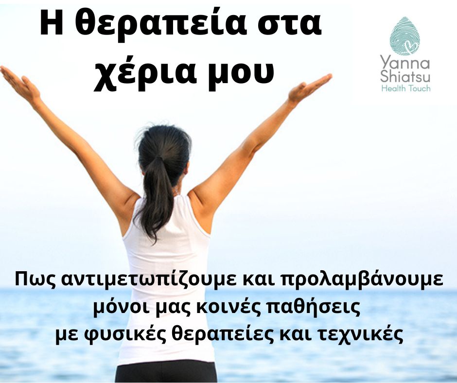 Σε αυτά τα εργαστήρια Η θεραπεία στα χέρια μου θα μάθουμε τι χρειάζεται το σώμα, ο νούς και η ψυχή μας για να είμαστε υγιείς. Με απλές τεχνικές και φυσικές θεραπείες που όλοι μπορούμε να χρησιμοποιήσουμε για εμάς αλλά και για τους δικούς μας ανθρώπους.